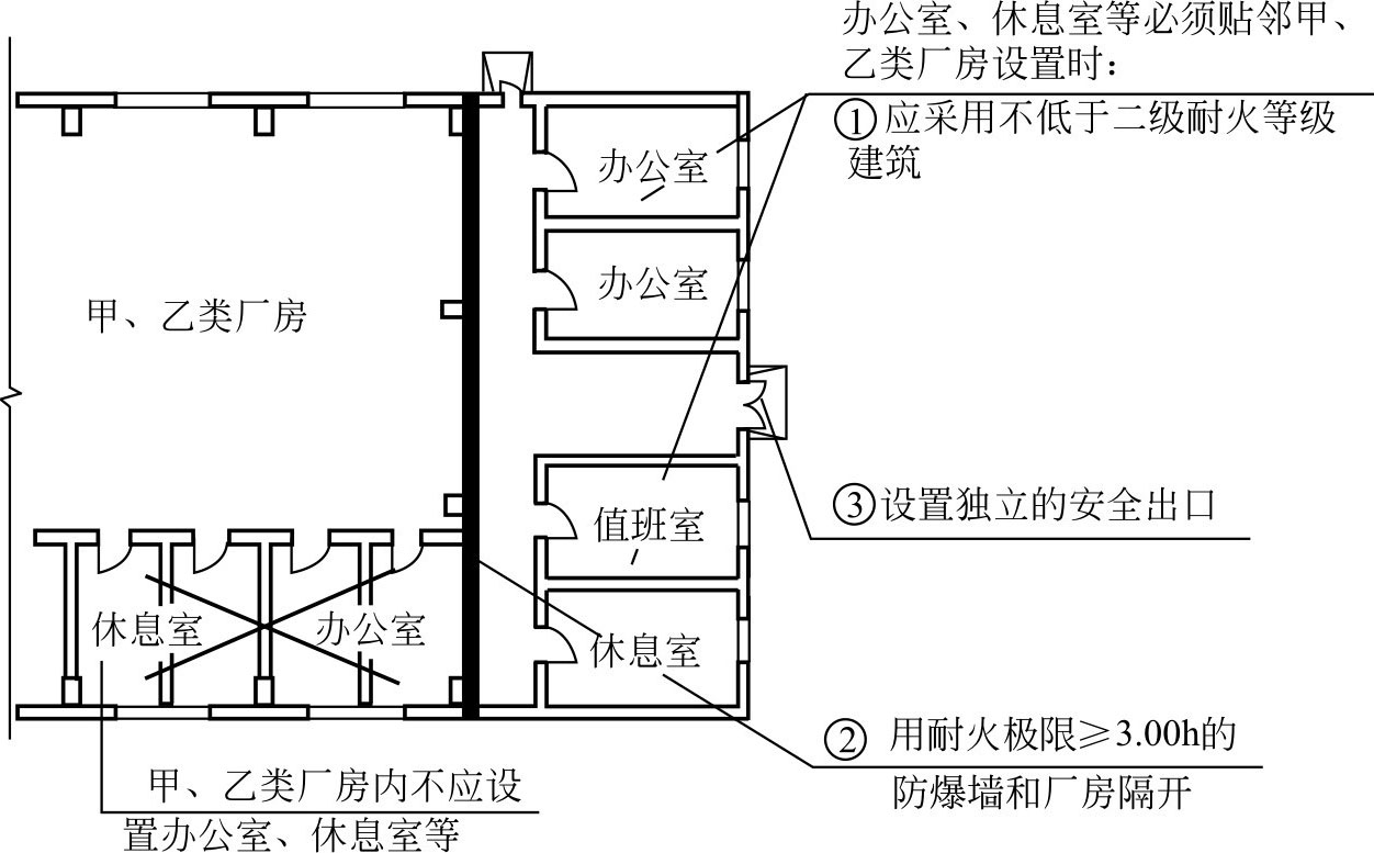 办公室、休息室等不应设置在甲、乙类厂房内,确需贴邻本厂房时,其耐火等级不应低于二级,并应采用耐火极限不低于3.00h的防爆墙与厂房分隔,且应设置独立的安全出口,如图2-7所示。