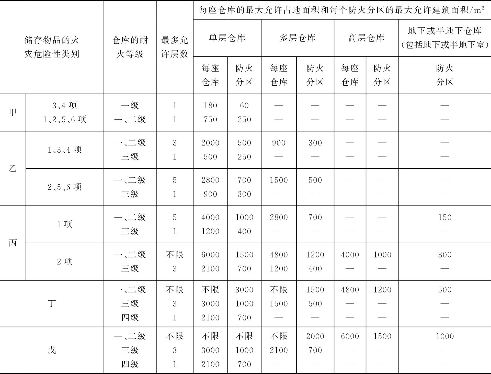 注:1.仓库内的防火分区之间必须采用防火墙分隔,甲、乙类仓库内防火分区之间的防火墙不应开设门、窗、洞口;地下或半地下仓库(包括地下或半地下室)的最大允许占地面积,不应大于相应类别地上仓库的最大允许占地面积。