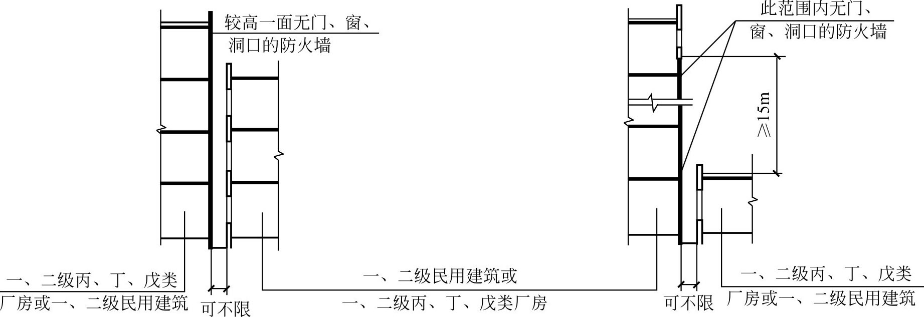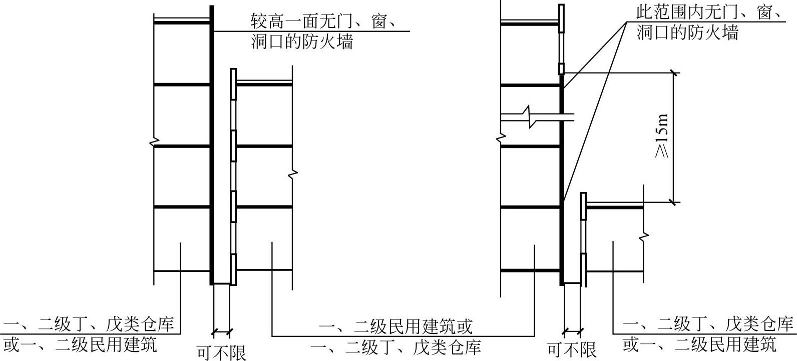 ①当较高一面外墙为无门、窗、洞口的防火墙,或比相邻较低一座建筑屋面高15m及以下范围内的外墙为无门、窗、洞口的防火墙时,其防火间距不限,如图2-15所示。