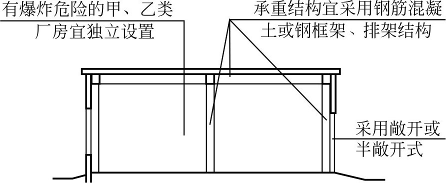 (1)有爆炸危险的甲、乙类厂房宜独立设置,并宜采用敞开或半敞开式。其承重结构宜采用钢筋混凝土或钢框架、排架结构,如图2-17所示。