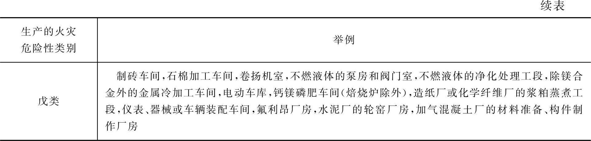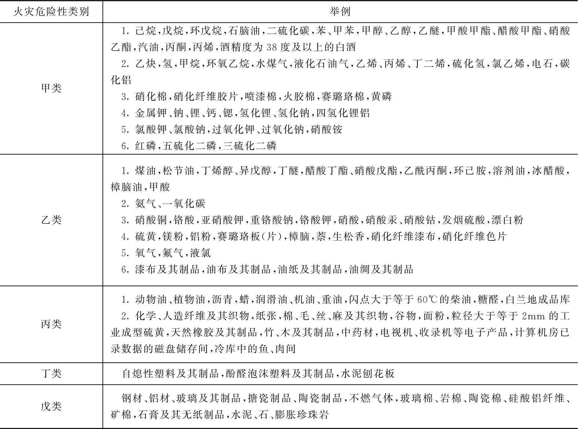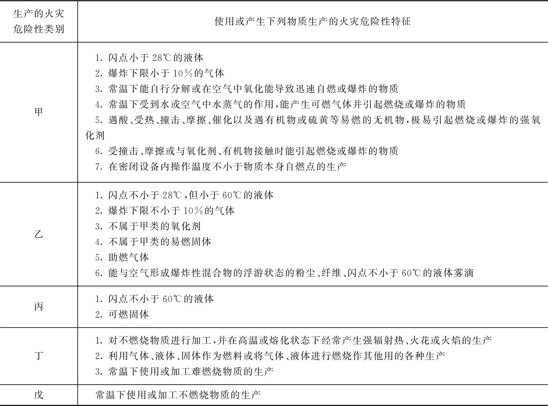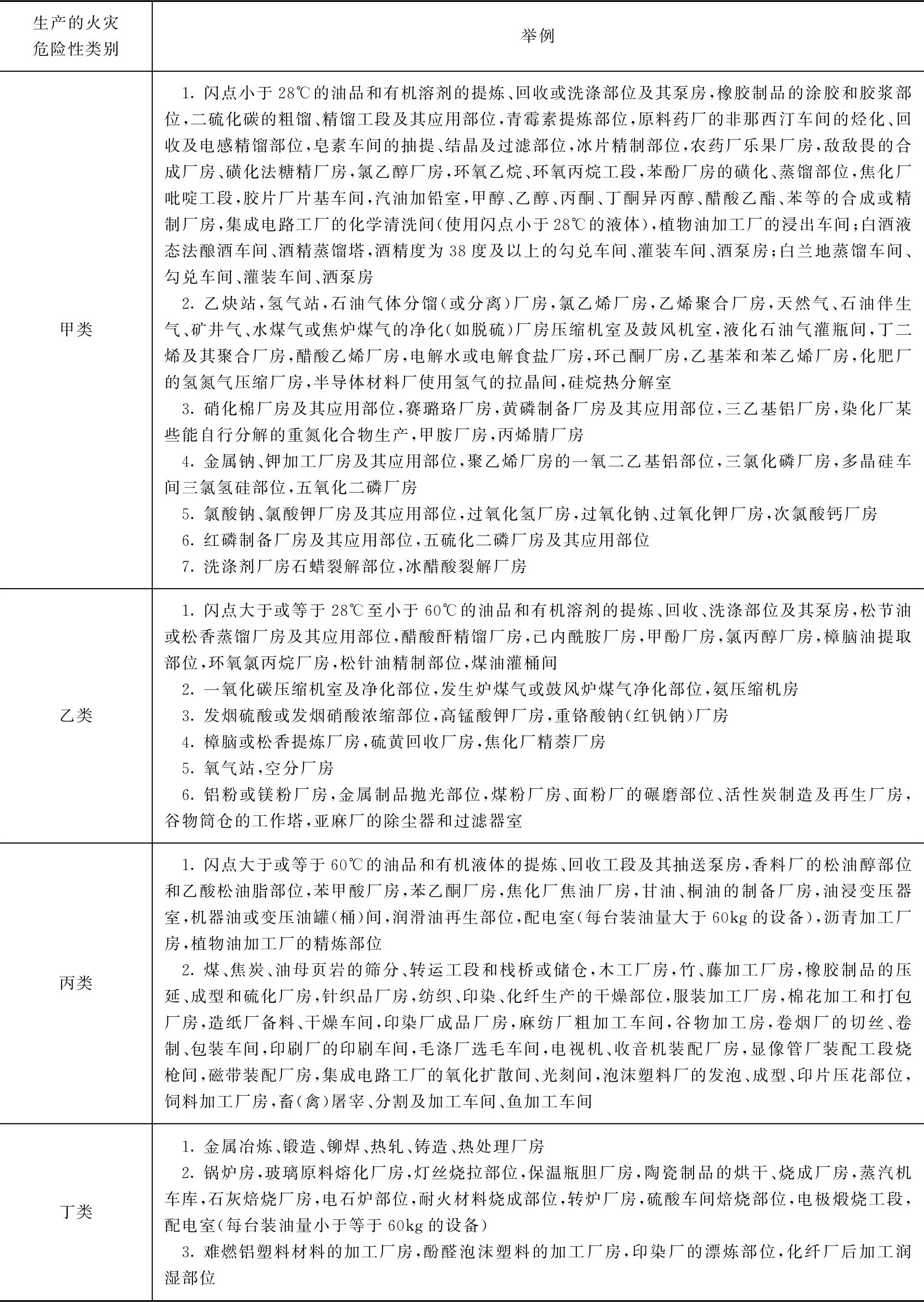 生产的火灾危险性分类受众多因素的影响,设计还需要根据生产工艺、生产过程中使用的原材料以及产品及其副产品的火灾危险性以及生产时的实际环境条件等情况确定。为便于使用,表2-2列举了部分常见生产的火灾危险性分类。