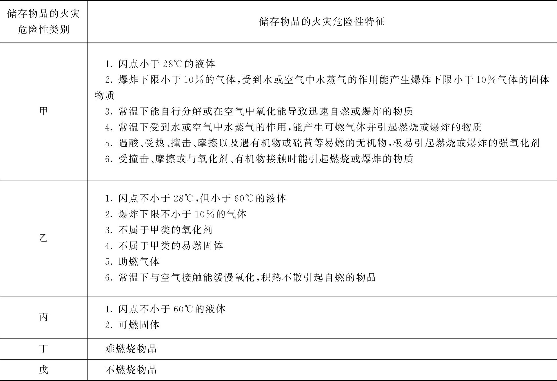 (3)储存物品的火灾危险性应根据储存物品的性质和储存物品中的可燃物数量等因素划分,可分为甲、乙、丙、丁、戊类,并应符合表2-3的规定。