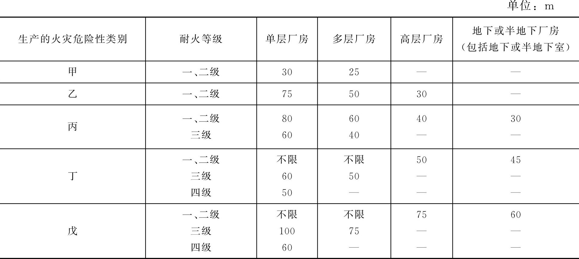 (1)除《建筑设计防火规范》(GB 50016—2014)另有规定外,厂房之间及与乙、丙、丁、戊类仓库、民用建筑等的防火间距不应小于表2-8的规定,与甲类仓库的防火间距应符合表2-10的规定。