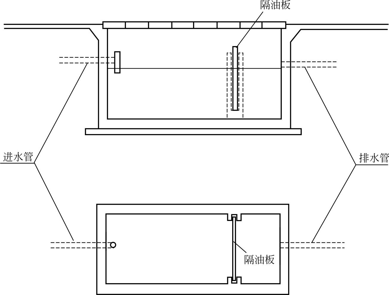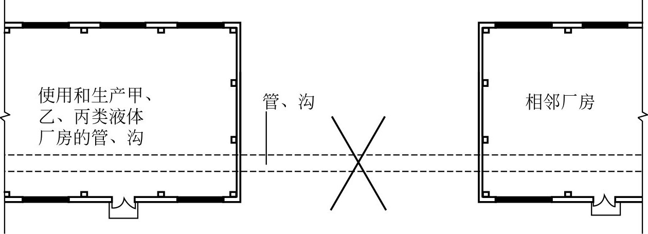 (11)使用和生产甲、乙、丙类液体的厂房,其管、沟不应与相邻厂房的管、沟相通(图2-26),下水道应设置隔油设施,如图2-27所示。
