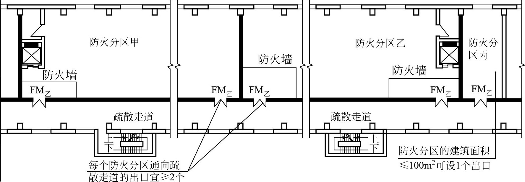 ②每座仓库的安全出口不应少于2个,当一座仓库的占地面积不大于300m 2 时,可设置1个安全出口。仓库内每个防火分区通向疏散走道、楼梯或室外的出口不宜少于2个,当防火分区的建筑面积不大于100m 2 时,可设置1个出口。通向疏散走道或楼梯的门应为乙级防火门,如图2-34所示。