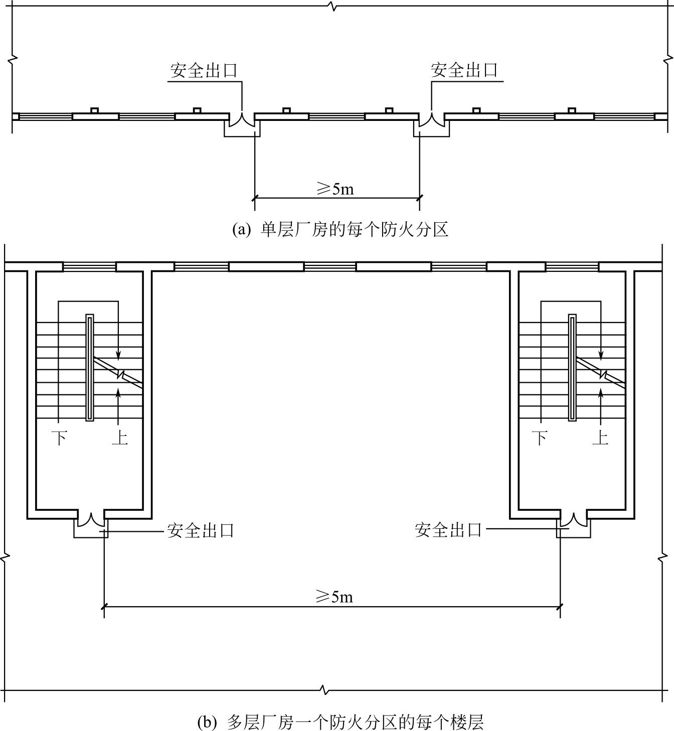 (1)厂房的安全出口应分散布置。每个防火分区或一个防火分区的每个楼层,其相邻2个安全出口最近边缘之间的水平距离不应小于5m,如图2-30所示。