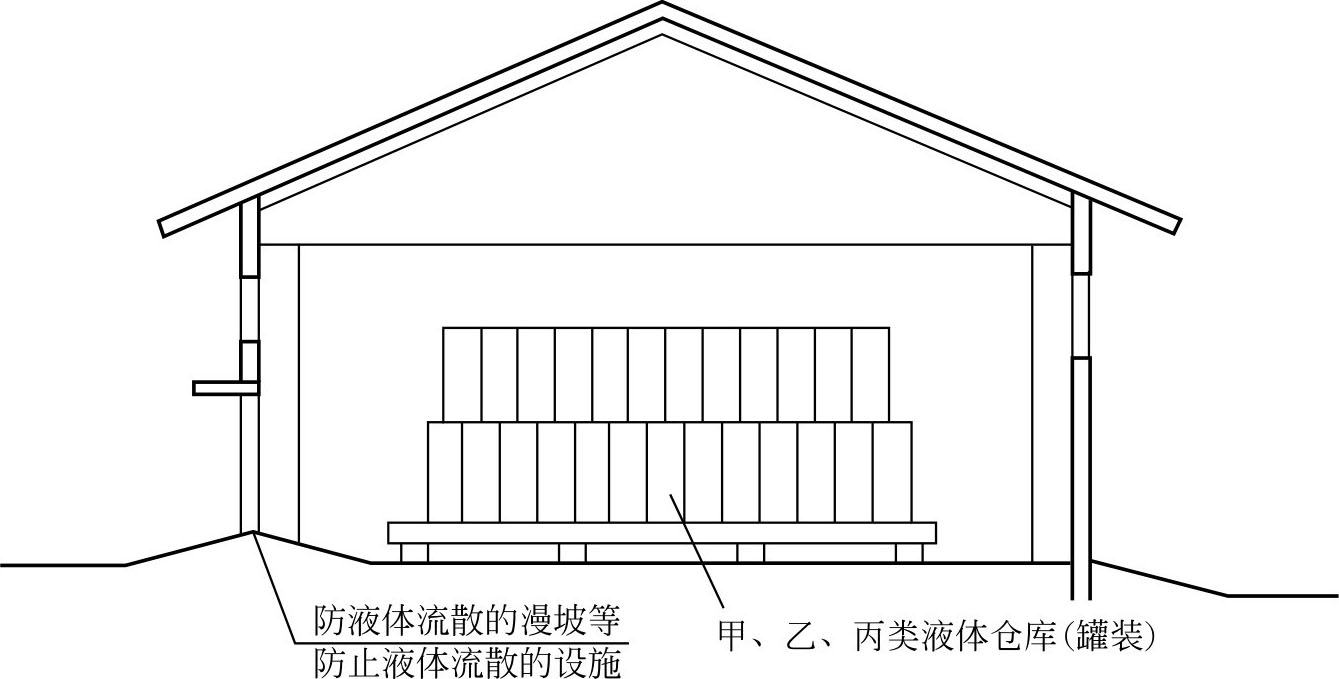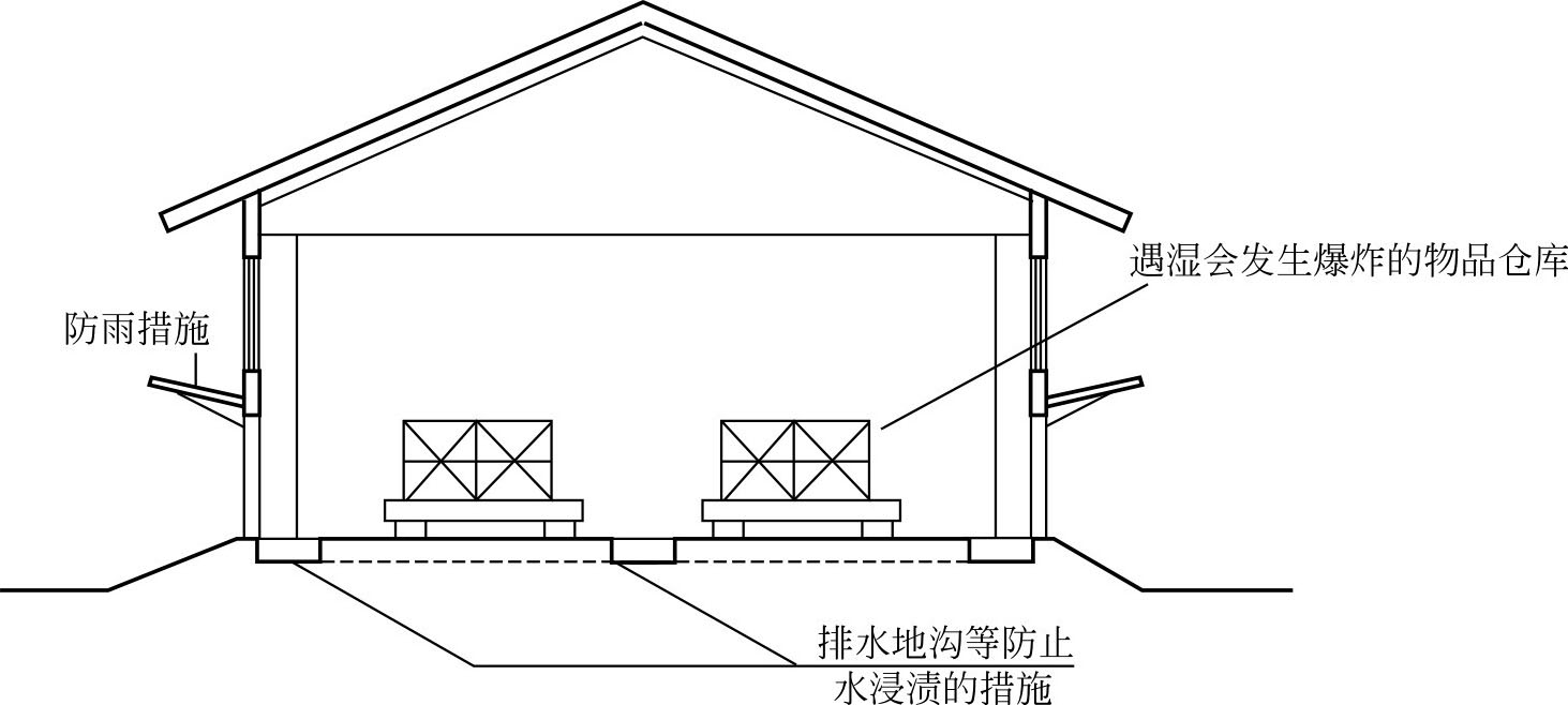 (12)甲、乙、丙类液体仓库应设置防止液体流散的设施,如图2-28所示。遇湿会发生燃烧爆炸的物品仓库应采取防止水浸渍的措施,如图2-29所示。