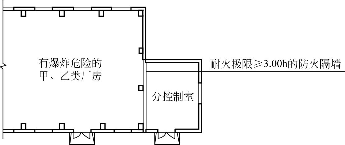 (9)有爆炸危险的甲、乙类厂房的分控制室宜独立设置,当贴邻外墙设置时,应采用耐火极限不低于3.00h的防火隔墙与其他部位分隔,如图2-24所示。