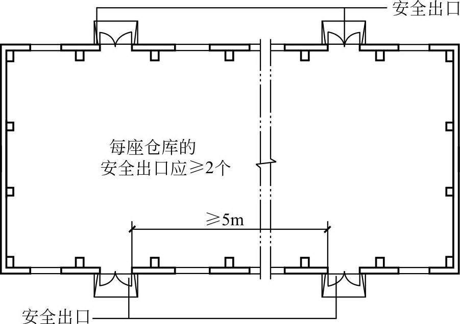 ①仓库的安全出口应分散布置。每个防火分区或一个防火分区的每个楼层,其相邻2个安全出口最近边缘之间的水平距离不应小于5m,如图2-33所示。