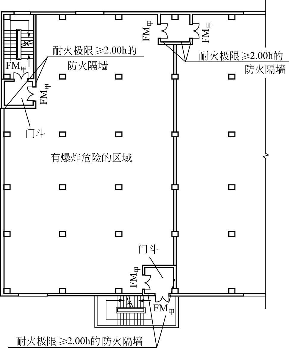 (10)有爆炸危险区域内的楼梯间、室外楼梯或有爆炸危险的区域与相邻区域连通处,应设置门斗等防护措施。门斗的隔墙应为耐火极限不应低于2.00h的防火隔墙,门应采用甲级防火门并应与楼梯间的门错位设置,如图2-25所示。