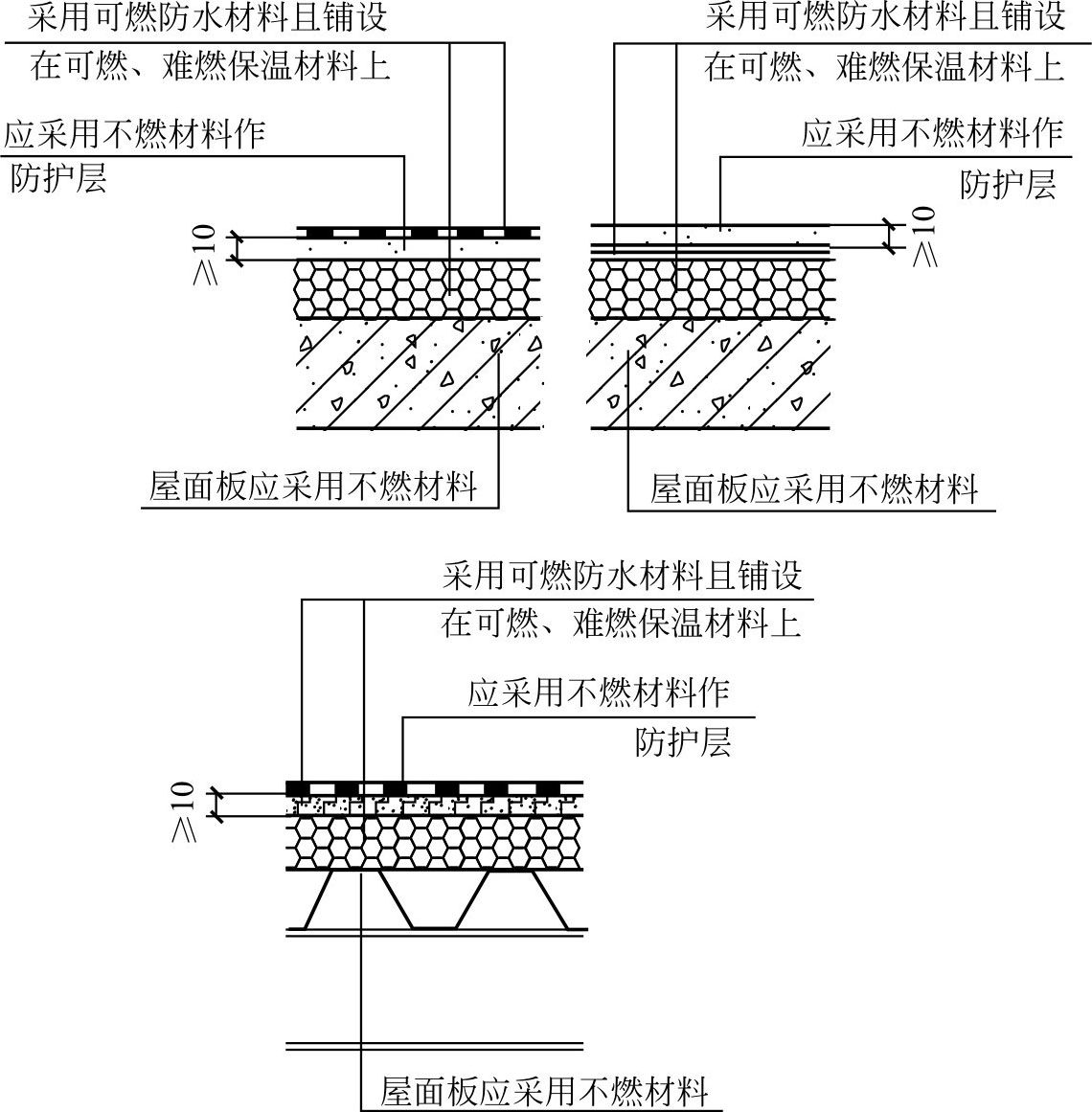 屋面防水层宜采用不燃、难燃材料,当采用可燃防水材料且铺设在可燃、难燃保温材料上时,防水材料或可燃、难燃保温材料应采用不燃材料作防护层,如图2-4所示。