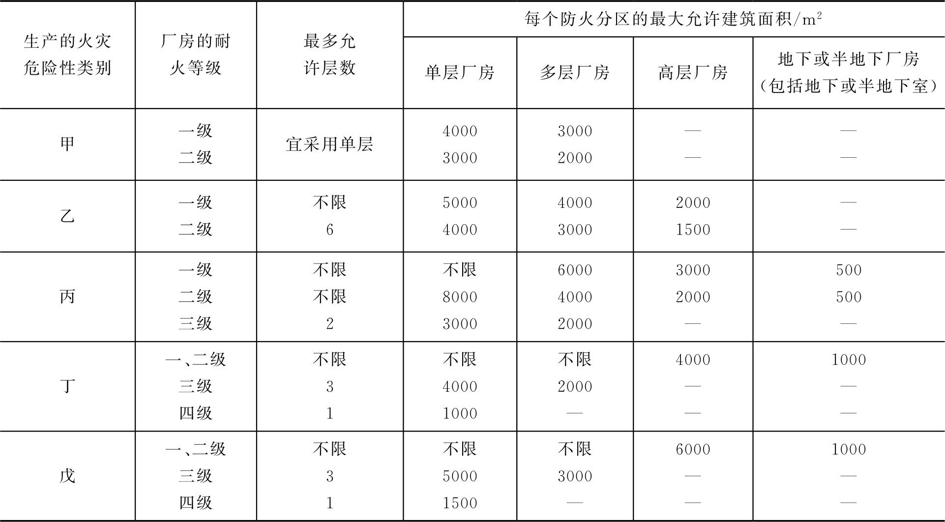 注:1.防火分区之间应采用防火墙分隔。除甲类厂房外的一、二级耐火等级厂房,当其防火分区的建筑面积大于本表规定,且设置防火墙确有困难时,可采用防火卷帘或防火分隔水幕分隔。采用防火卷帘时,应符合《建筑设计防火规范》(GB 50016—2014)第6.5.3条的规定;采用防火分隔水幕时,应符合现行国家标准《自动喷水灭火系统设计规范(2005年版)》(GB 50084—2001)的规定。