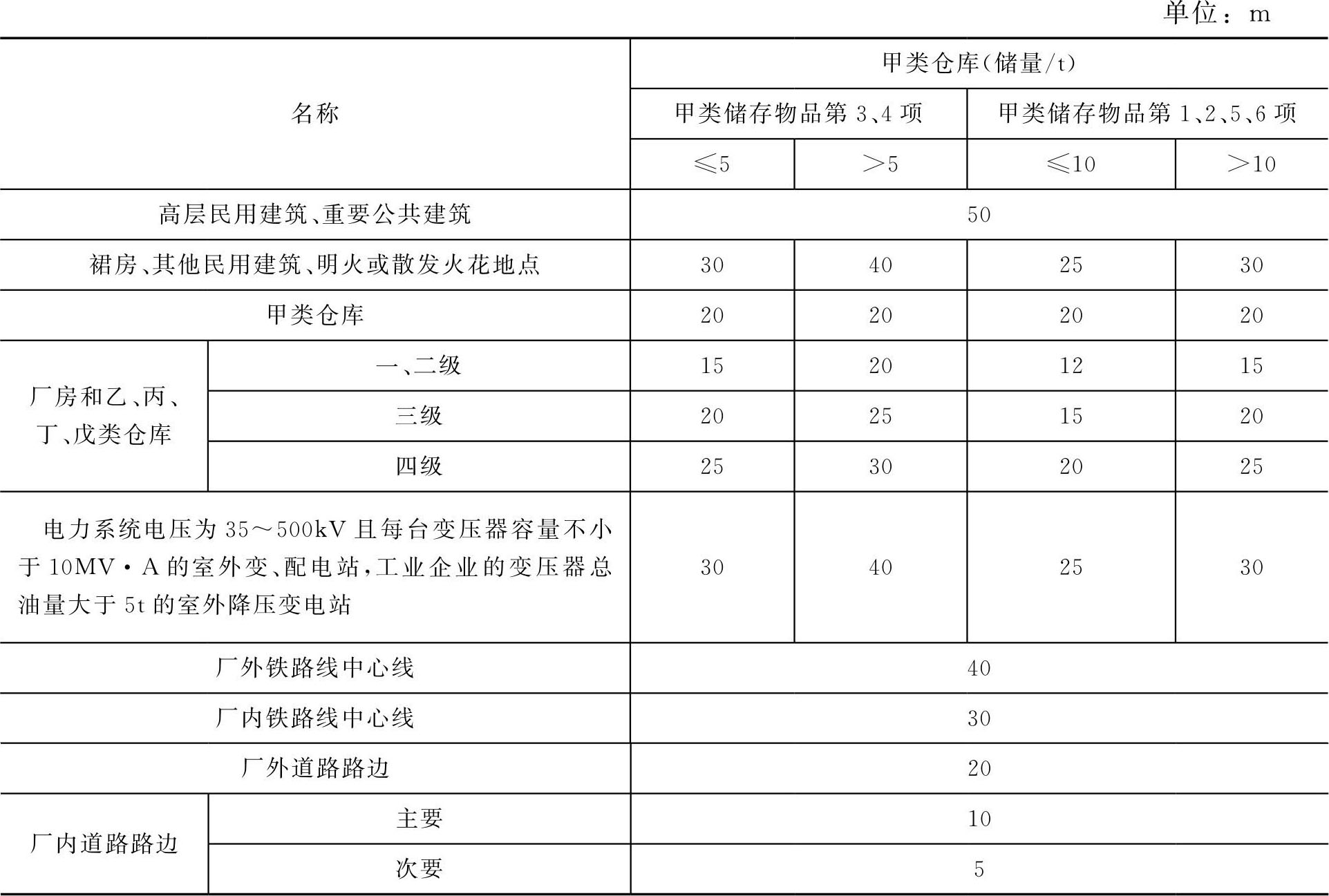 注:甲类仓库之间的防火间距,当第3、4项物品储量不大于2t,第1、2、5、6项物品储量不大于5t时,不应小于12m。甲类仓库与高层仓库的防火间距不应小于13m。