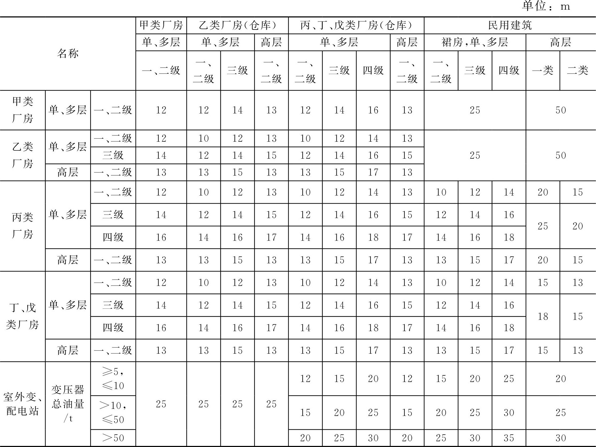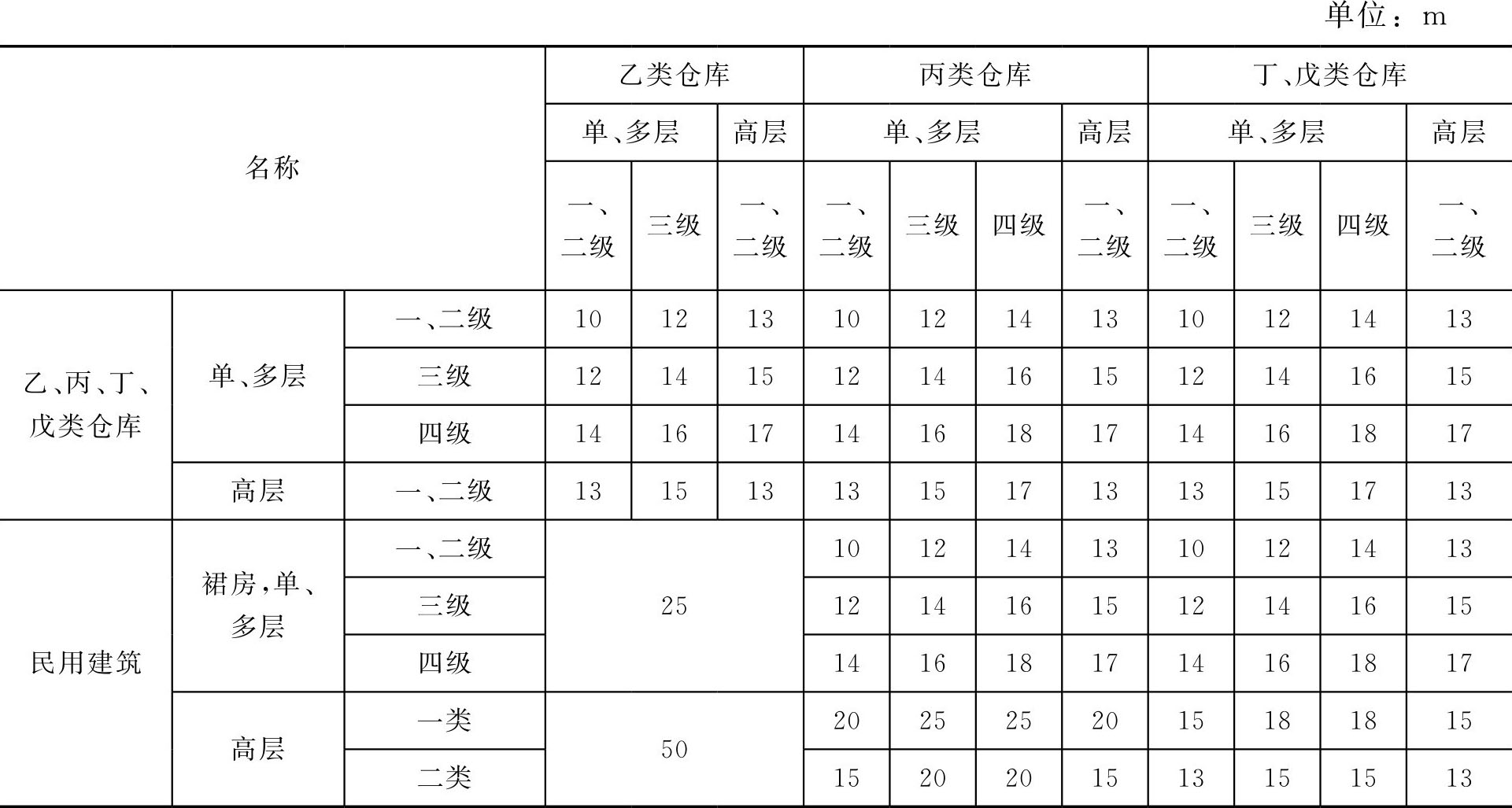 表2-8 厂房之间及与乙、丙、丁、戊类仓库、民用建筑等的防火间距