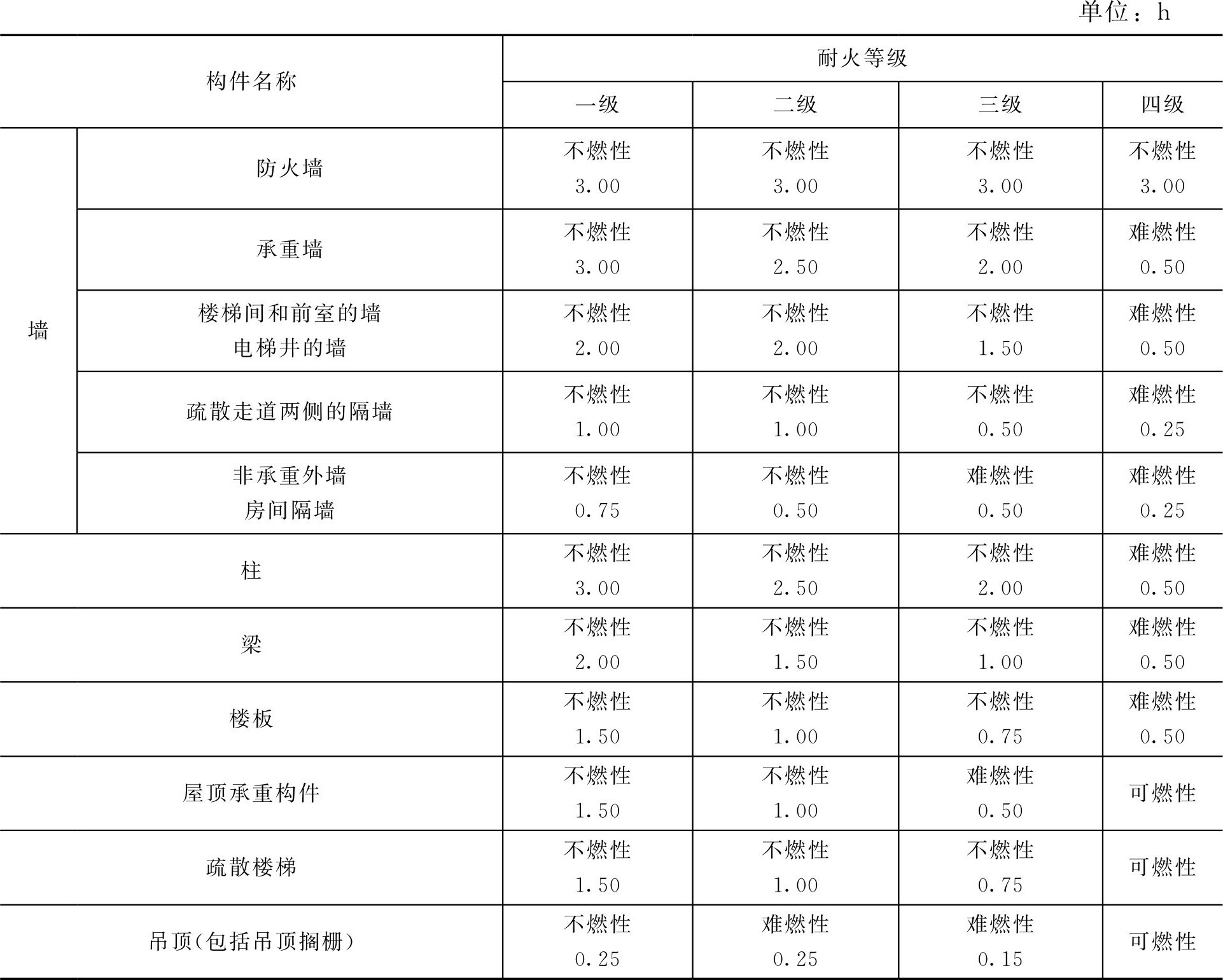 注:二级耐火等级建筑内采用不燃材料的吊顶,其耐火极限不限。