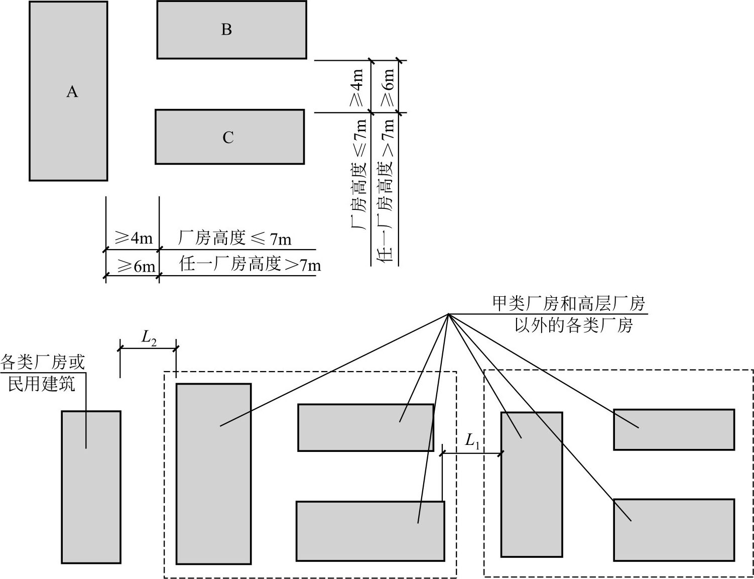 L 1 —组和组间相邻厂房之间的距离; L 2 —组中厂房与邻近建筑物之间的距离