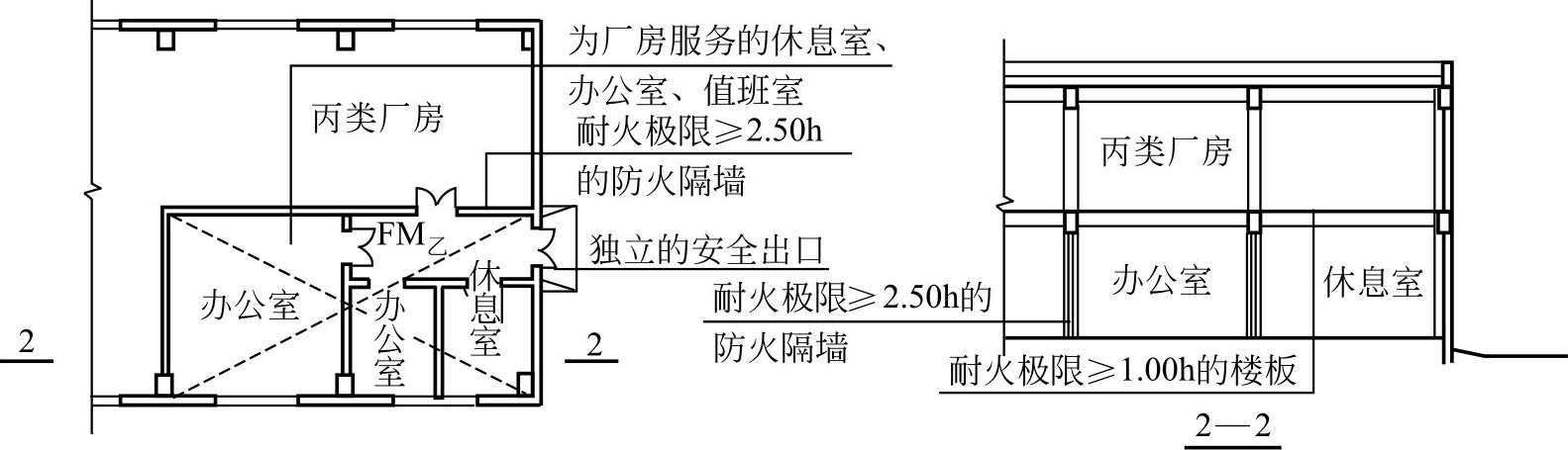 图2-8 丙类厂房内设置办公室、休息室示意图