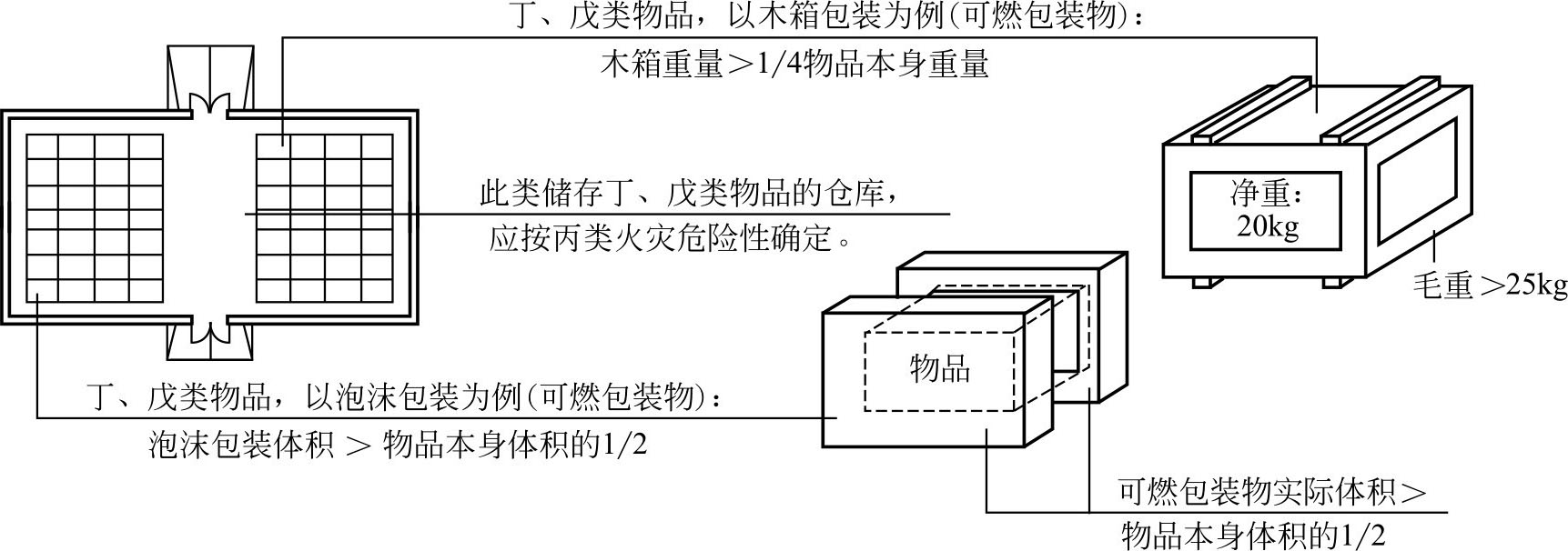 (5)丁、戊类储存物品仓库的火灾危险性,当可燃包装重量大于物品本身重量1/4或可燃包装体积大于物品本身体积的1/2时,应按丙类确定,如图2-1所示。
