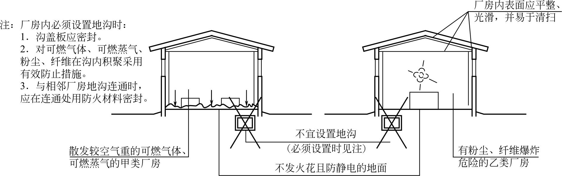 ③厂房内不宜设置地沟,确需设置时,其盖板应严密,地沟应采取防止可燃气体、可燃蒸气和粉尘、纤维在地沟积聚的有效措施,且应在与相邻厂房连通处采用防火材料密封。
