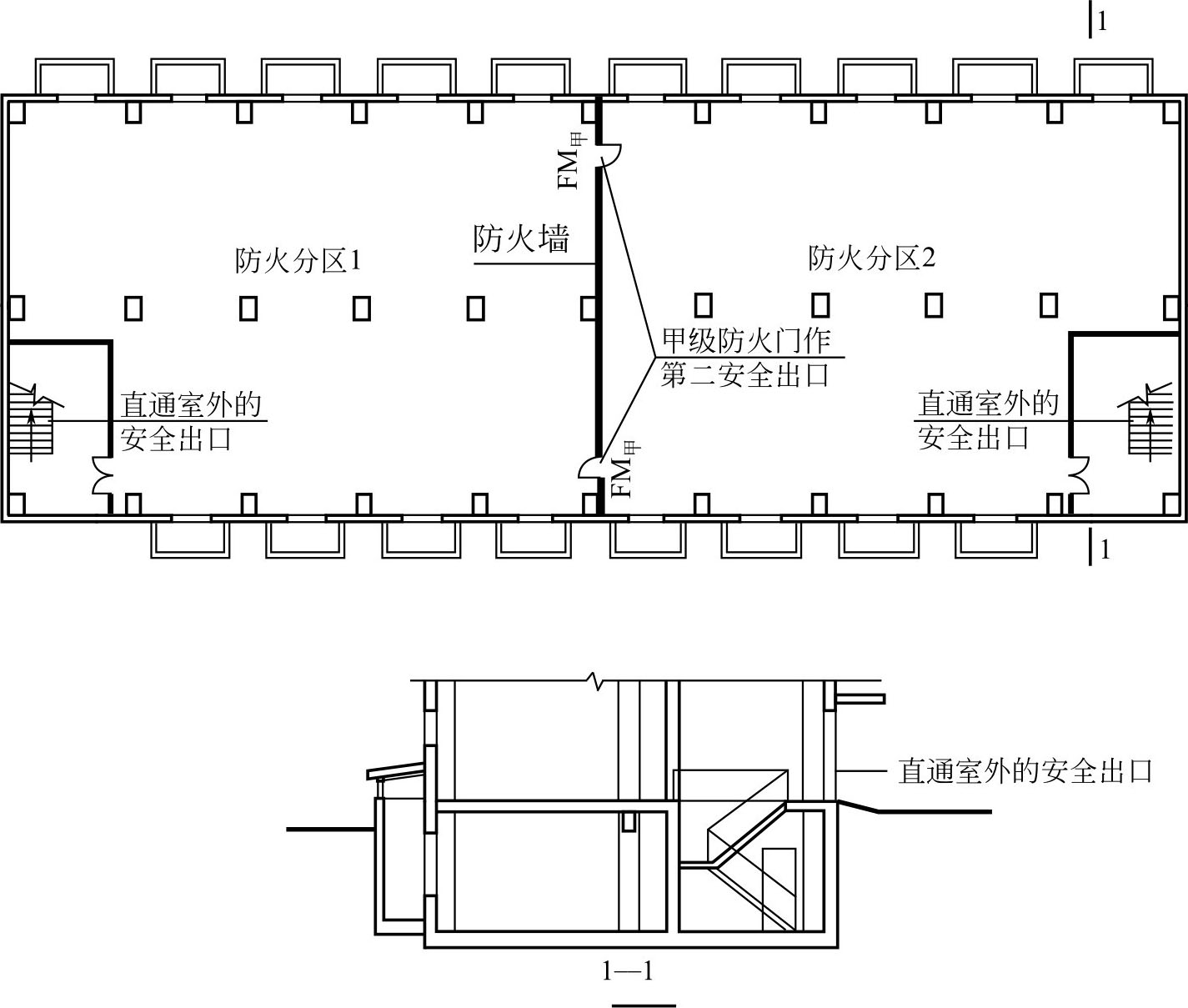 (3)地下或半地下厂房(包括地下室或半地下室),当有多个防火分区相邻布置,并采用防火墙分隔时,每个防火分区可利用防火墙上通向相邻防火分区的甲级防火门作为第二安全出口,但每个防火分区必须至少有1个直通室外的独立安全出口,如图2-31所示。