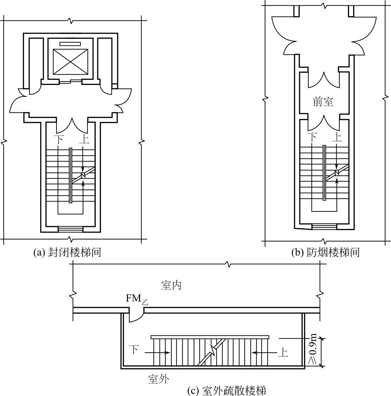 (6)高层厂房和甲、乙、丙类多层厂房的疏散楼梯应采用封闭楼梯间或室外楼梯。建筑高度大于32m且任一层人数超过10人的厂房,应采用防烟楼梯间或室外楼梯,如图2-32所示。