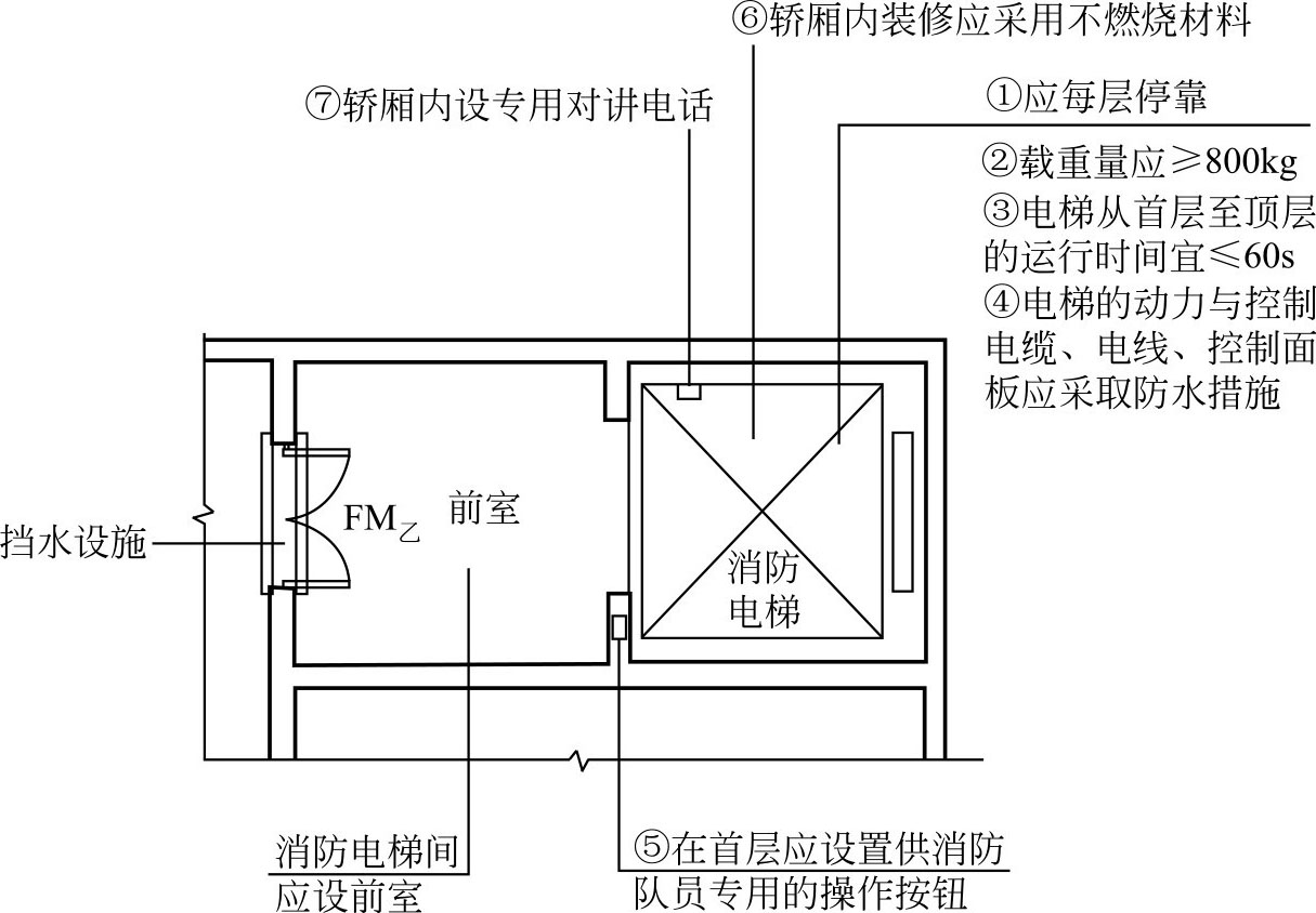 (6)消防电梯井、机房与相邻电梯井、机房之间应设置耐火极限不低于2.00h的防火隔墙,隔墙上的门应采用甲级防火门。