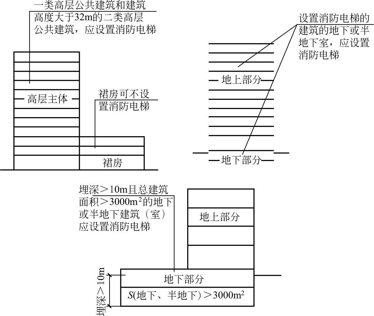 (3)建筑高度大于32m且设置电梯的高层厂房(仓库),每个防火分区内宜设置1台消防电梯,但符合下列条件的建筑可不设置消防电梯(图3-28)。
