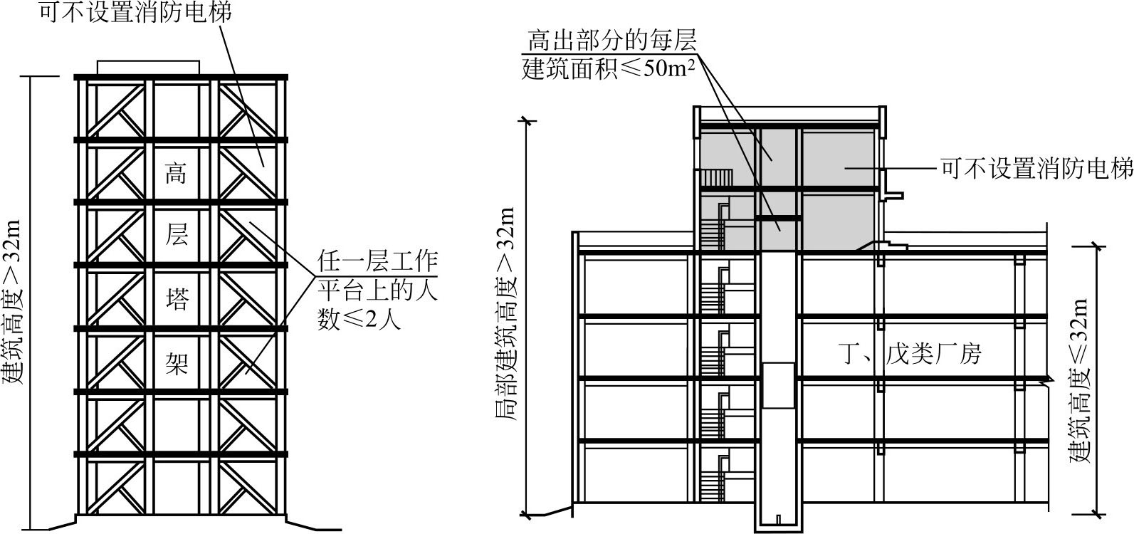 ①建筑高度大于32m且设置电梯,任一层工作平台上的人数不超过2人的高层塔架。