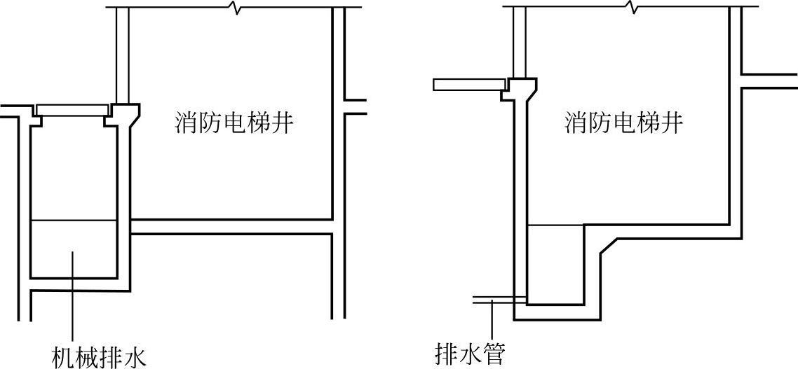 (7)消防电梯的井底应设置排水设施,排水井的容量不应小于2m 3 ,排水泵的排水量不应小于10L/s,如图3-29所示。消防电梯间前室的门口宜设置挡水设施。