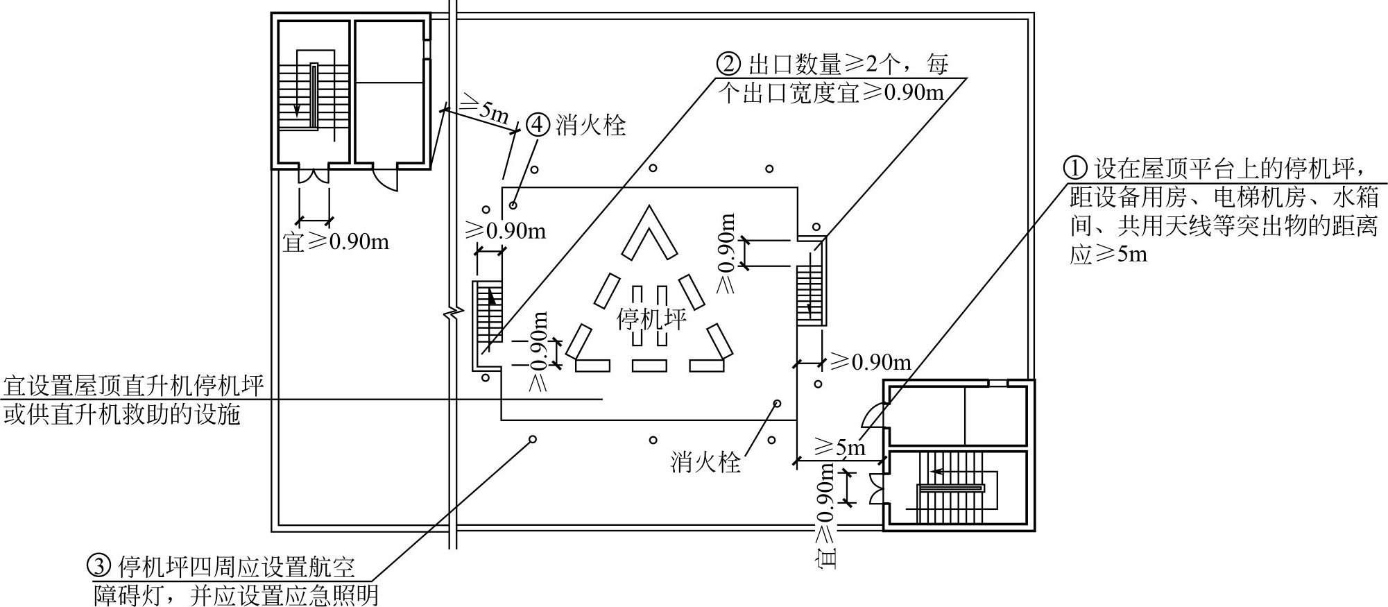 (1)建筑高度大于100m且标准层建筑面积大于2000m 2 的公共建筑,宜在屋顶设置直升机停机坪或供直升机救助的设施,如图3-31所示。