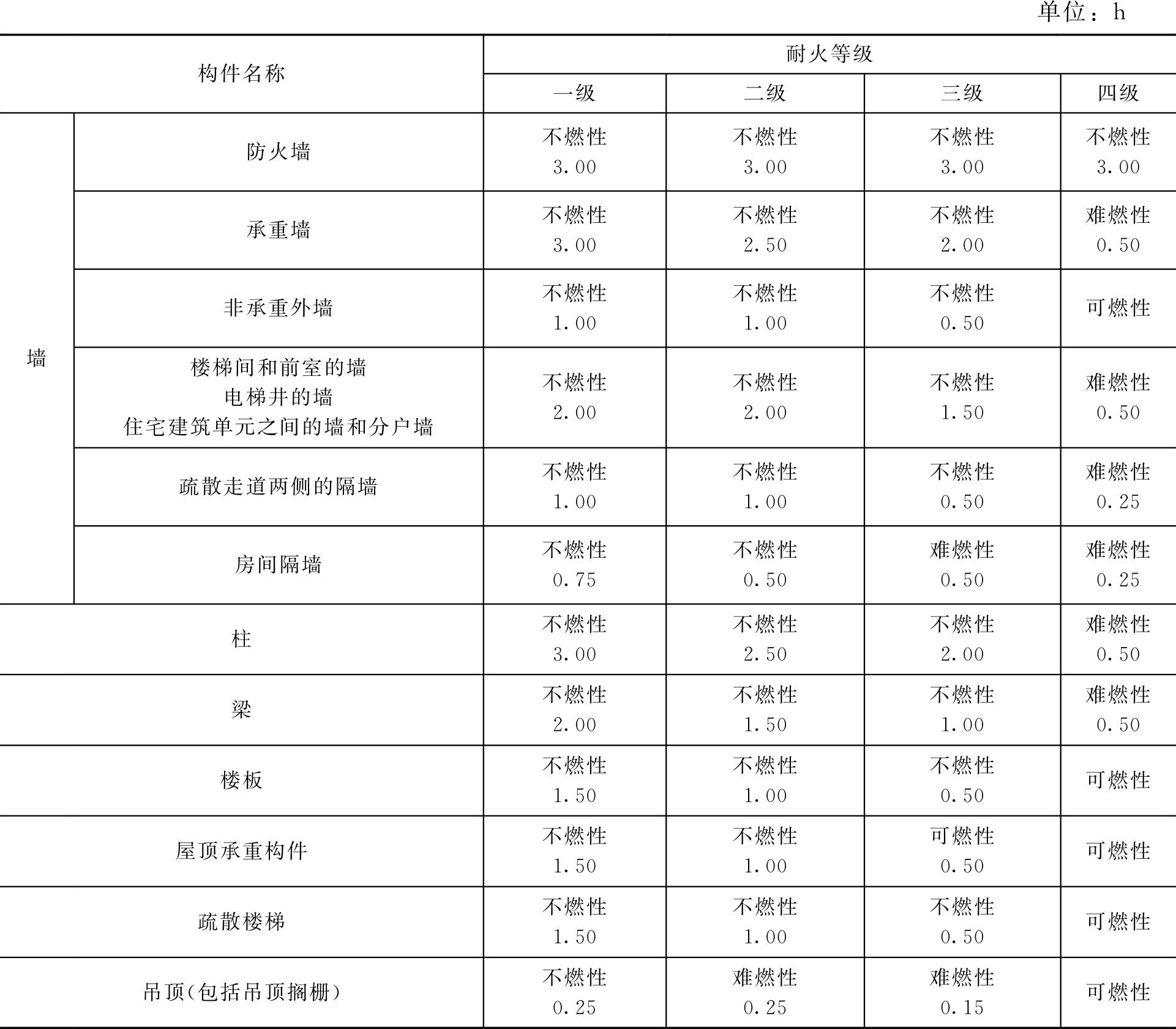 表1-2 不同耐火等级建筑相应构件的燃烧性能和耐火极限