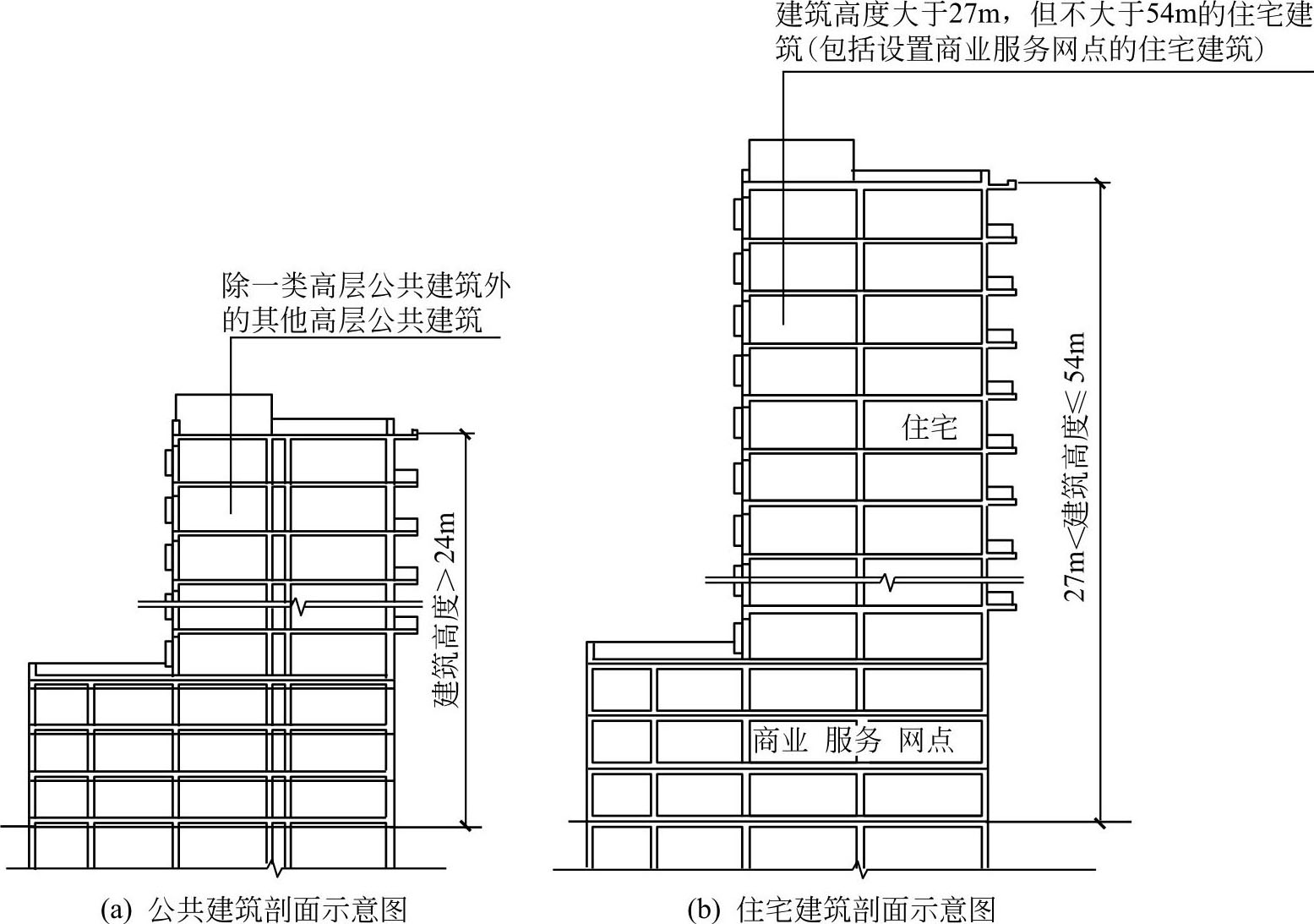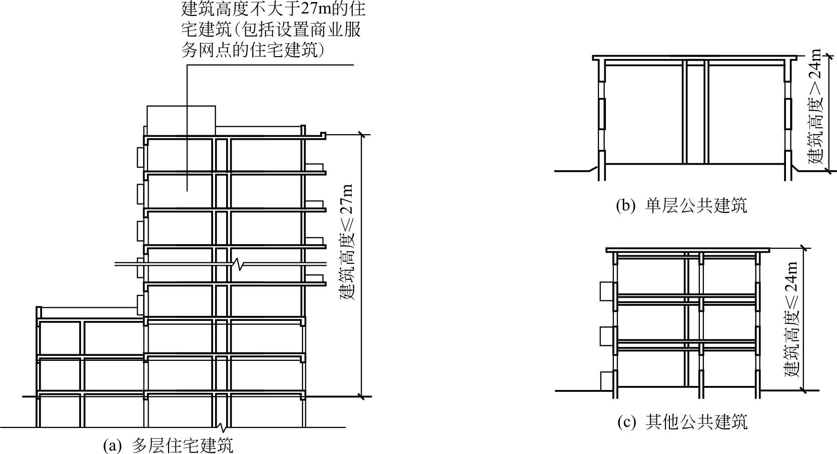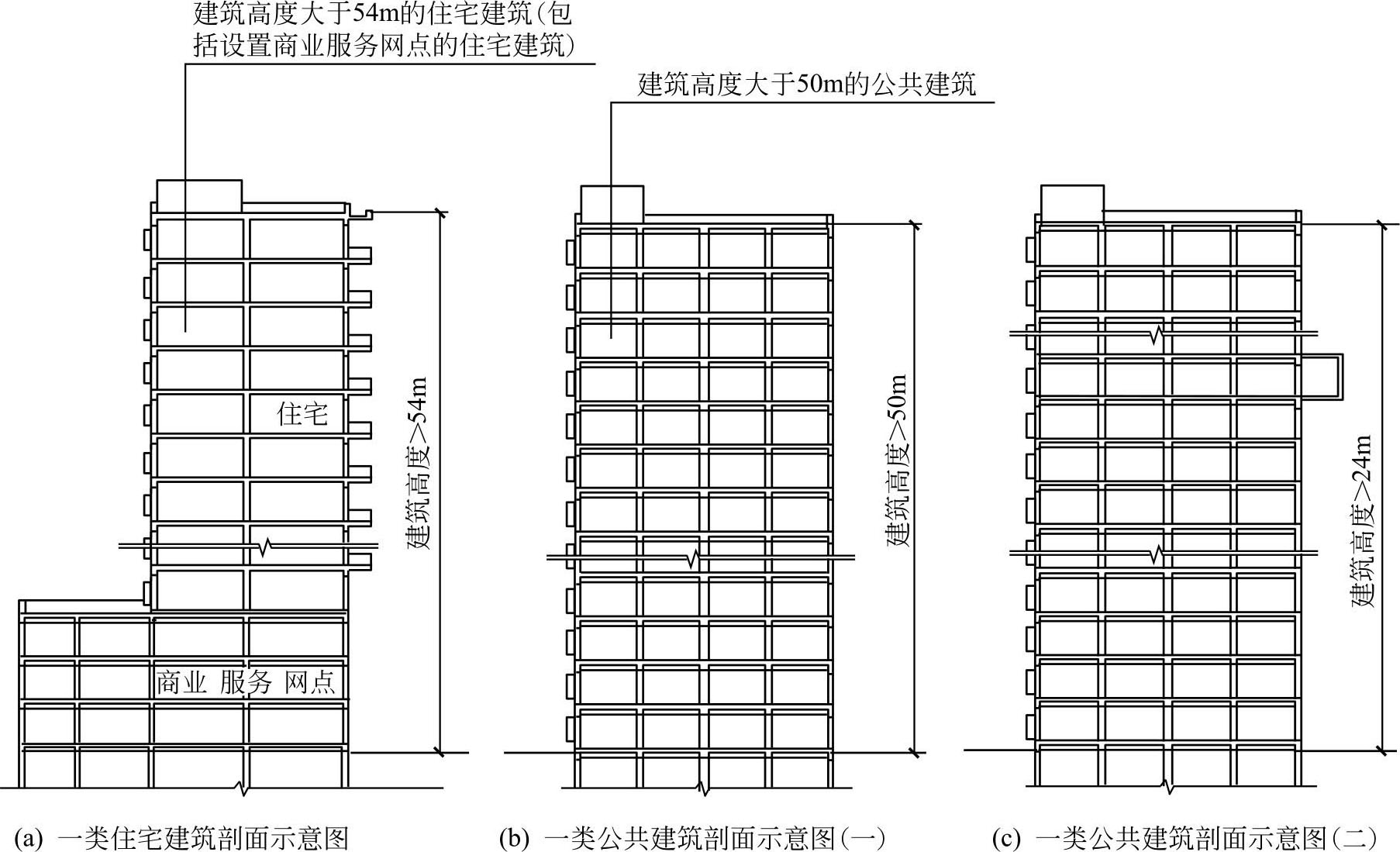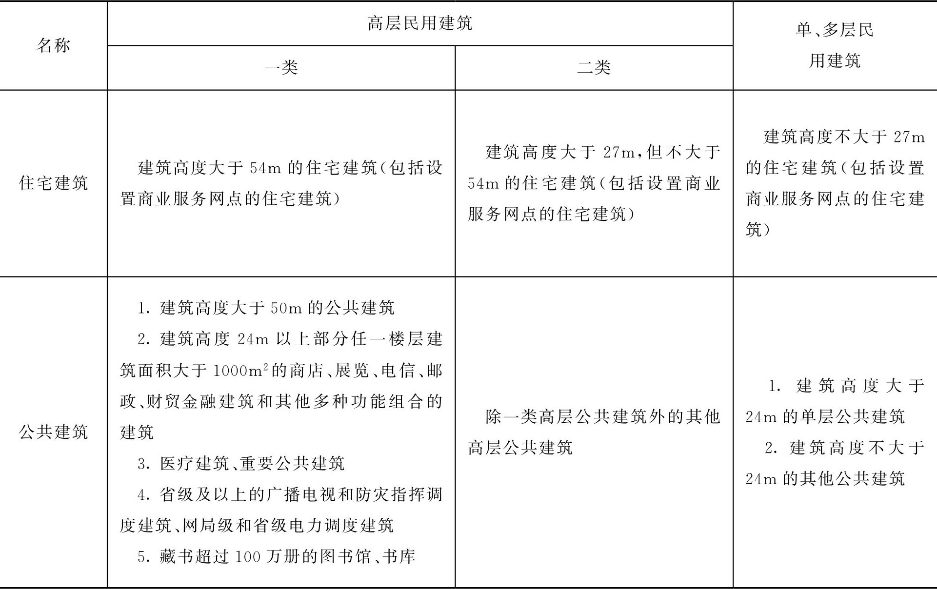 民用建筑应根据其使用性质、火灾危险性、疏散和扑救难度等进行分类,并应符合表1-1的规定,如图1-1~图1-3所示。