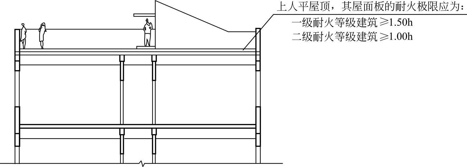 一、二级耐火等级建筑的上人平屋顶,其屋面板的耐火极限分别不应低于1.50h和1.00h,如图1-5所示。