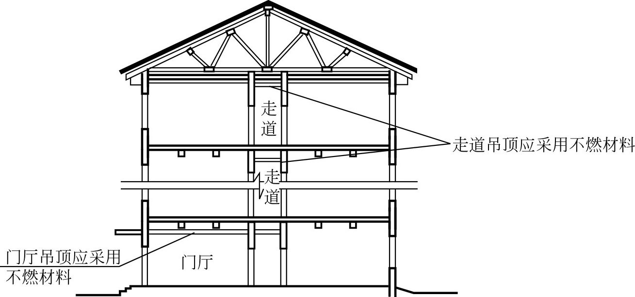 二、三级耐火等级建筑内门厅、走道的吊顶应采用不燃材料,如图1-9所示。