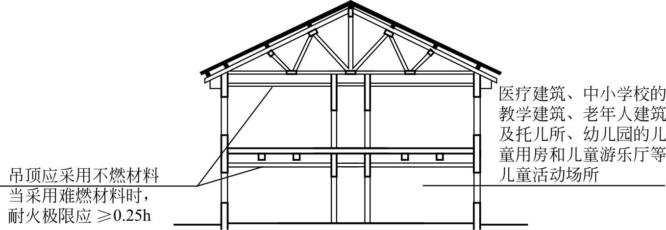 (7)二级耐火等级建筑内采用不燃材料的吊顶,其耐火极限不限 三级耐火等级的医疗建筑、中小学校的教学建筑、老年人建筑及托儿所、幼儿园的儿童用房和儿童游乐厅等儿童活动场所的吊顶,应采用不燃材料;当采用难燃材料时,其耐火极限不应低于0.25h,如图1-8所示。