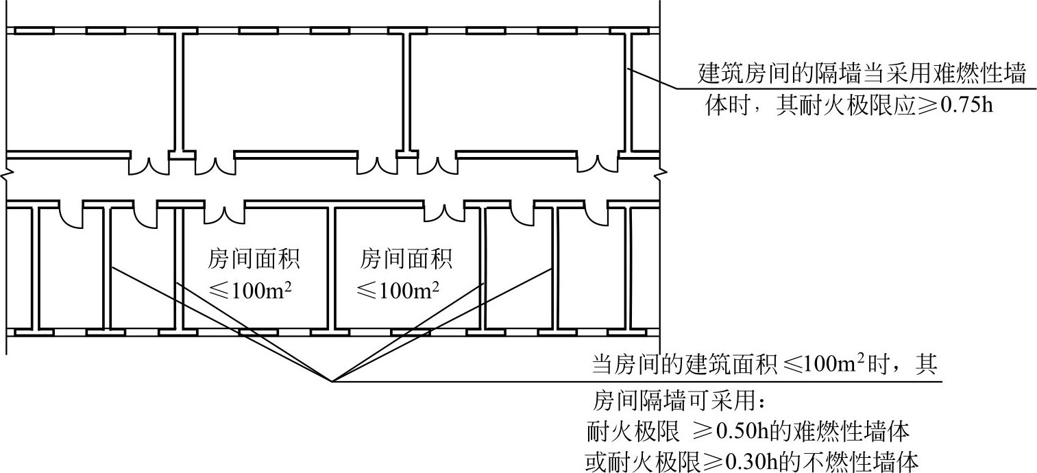 (5)二级耐火等级建筑内采用难燃性墙体的房间隔墙,其耐火极限不应低于0.75h;当房间的建筑面积不大于100m 2 时,房间隔墙可采用耐火极限不低于0.50h的难燃性墙体或耐火极限不低于0.30h的不燃性墙体,如图1-6所示。