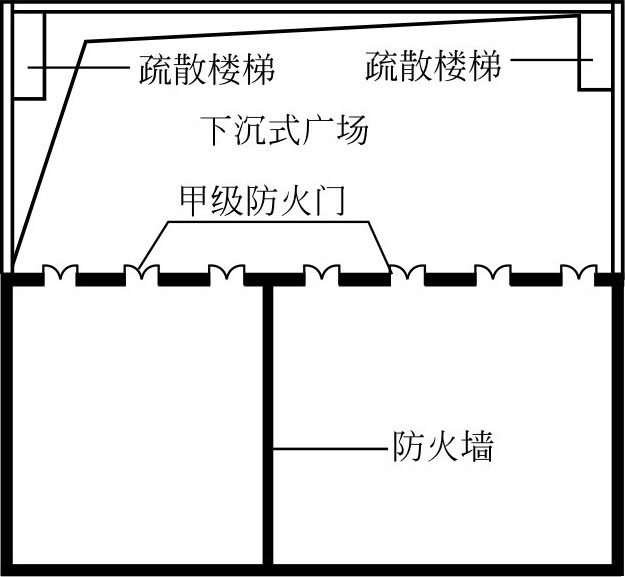 ①下沉式广场等室外开敞空间应能防止相邻区域的火灾蔓延和便于安全疏散,并应符合《建筑设计防火规范》(GB 50016—2014)第6.4.12条的规定,如图1-22所示。