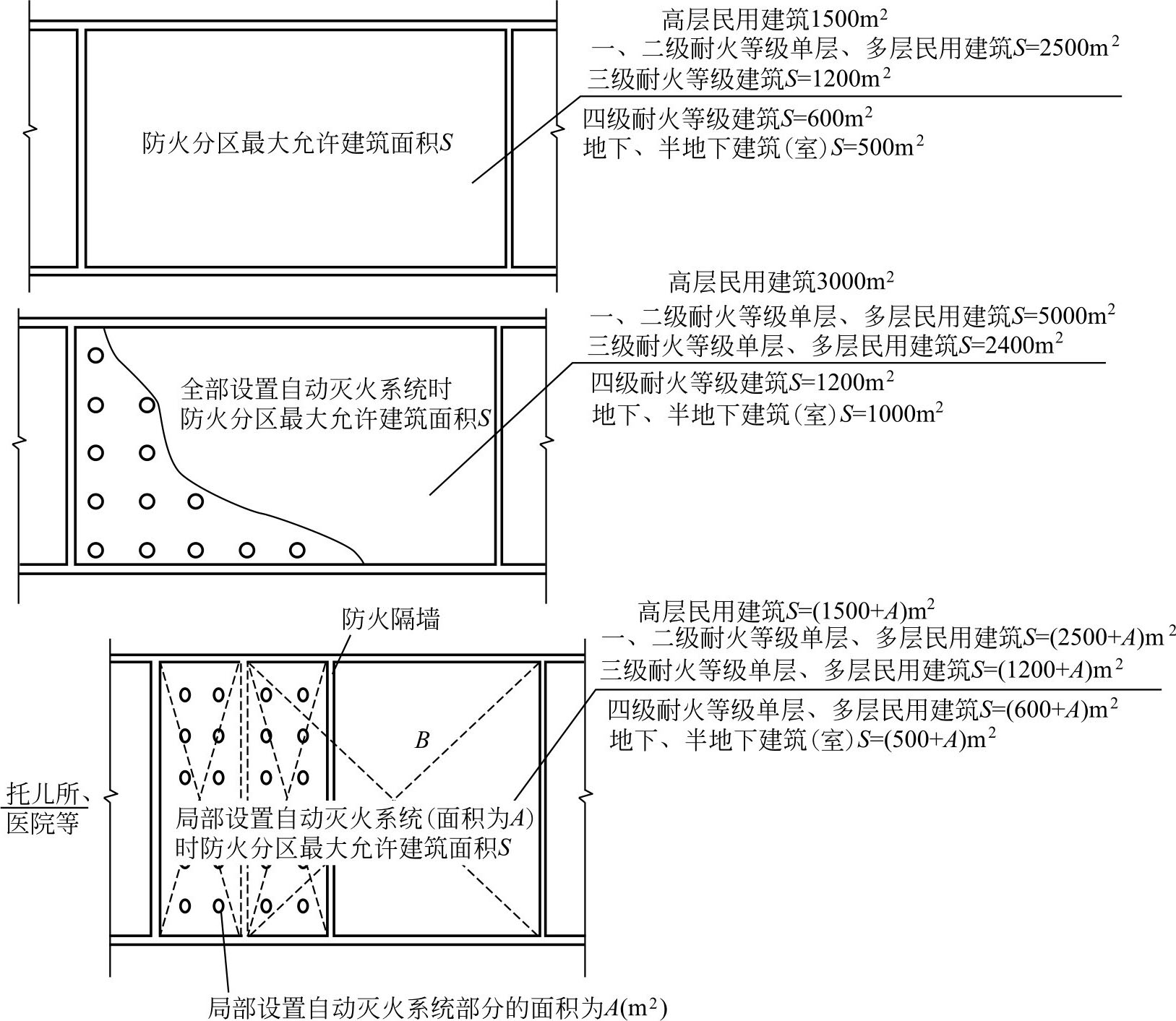 注:1.表中规定的防火分区最大允许建筑面积,当建筑内设置自动灭火系统时,可按本表的规定增加1.0倍;局部设置时,防火分区的增加面积可按该局部面积的1.0倍计算。