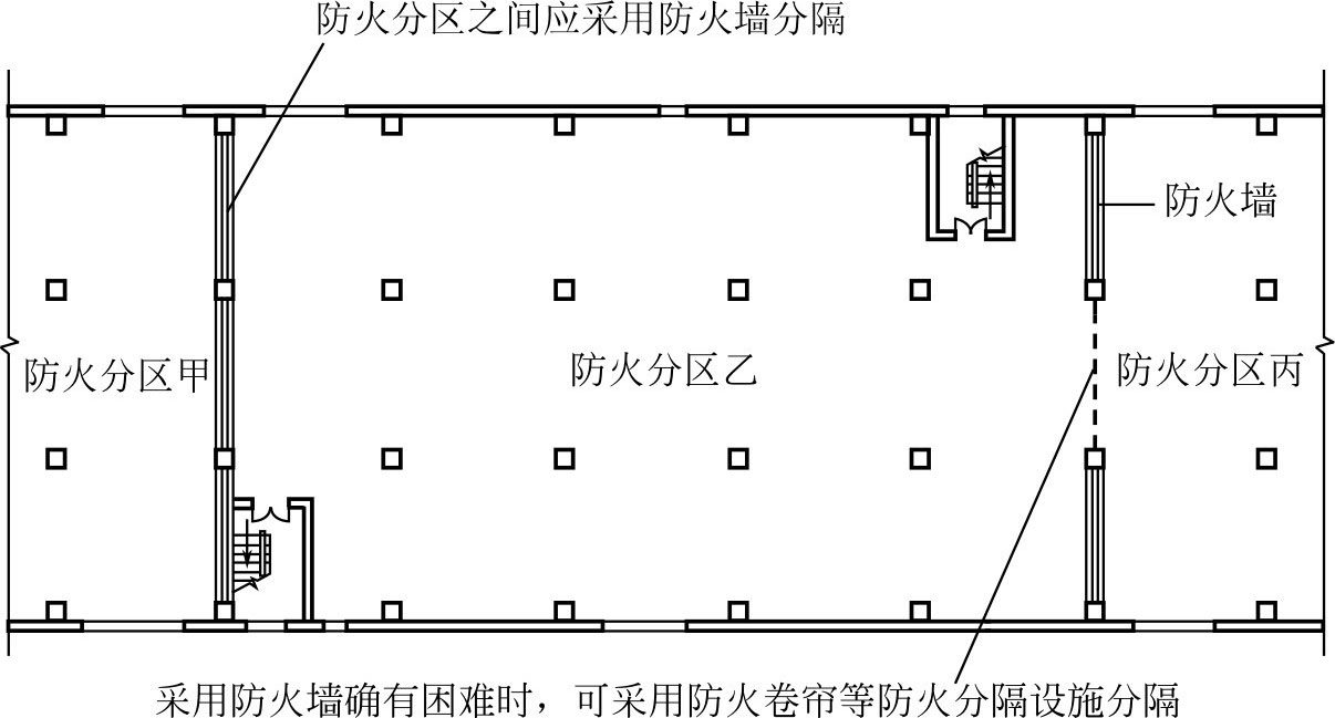 (4)防火分区之间应采用防火墙分隔,确有困难时,可采用防火卷帘等防火分隔设施分隔,如图1-17所示。