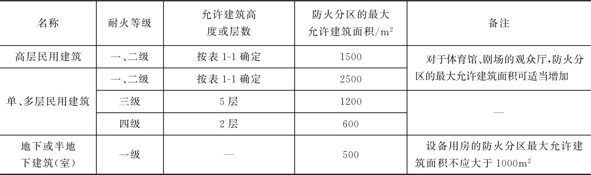 (2)一、二级耐火等级民用建筑的耐火性能较高,除了未加防火保护的钢结构以外,导致建筑物倒塌的可能性较小,一般能较好地限制火势蔓延,有利于安全疏散和扑救火灾,所以,规定其防火分区面积为2500m 2 。三级建筑物的屋顶是可燃的,能够导致火灾蔓延扩大,所以,其防火灾分区面积比一、二级要小,一般不超过1200m 2 。四级耐火等级建筑的构件大多数是难燃或可燃的,所以,其防火分区面积不宜超过600m 2 。同理,除了限制防火分区面积外,还对建筑物的层数和高度进行限制,见表1-4。