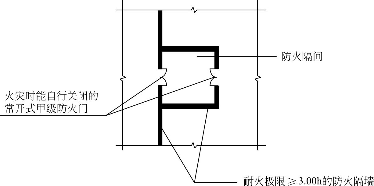②防火隔间的墙应为耐火极限不低于3.00h的防火隔墙,并应符合《建筑设计防火规范》(GB 50016—2014)第6.4.13条的规定,如图1-23所示。
