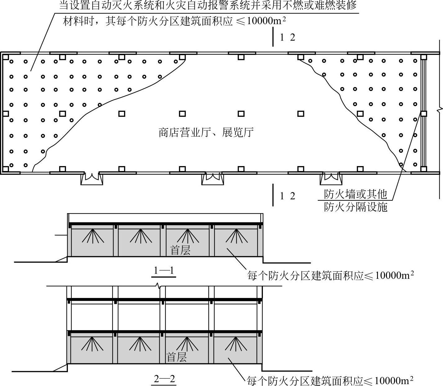 ②设置在单层建筑或仅设置在多层建筑的首层内时,不应大于10000m 2 ,如图1-19所示。