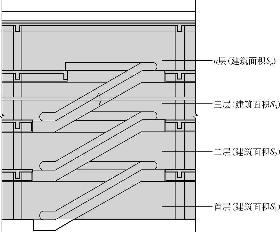注:以自动扶梯为例,其防火分区面积( S )应按上、下层相连通面积叠加计算,即 S = S 1 + S 2 +…+ S n ,当叠加计算后的建筑面积大于表1-4的规定时,应划分防火分区。