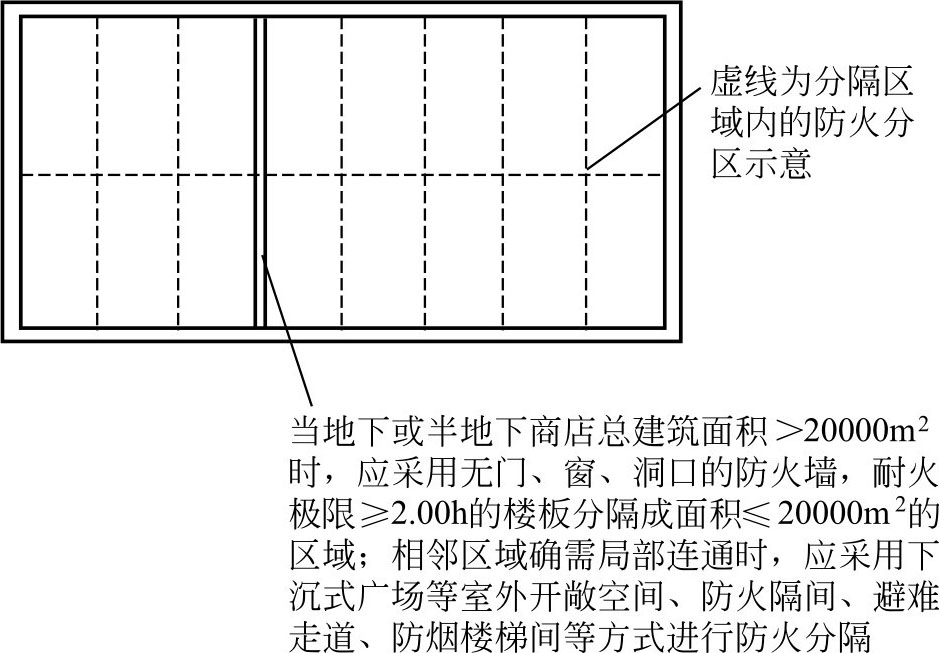 图1-21 总建筑面积大于20000m 2 的地下或半地下商店平面示意图