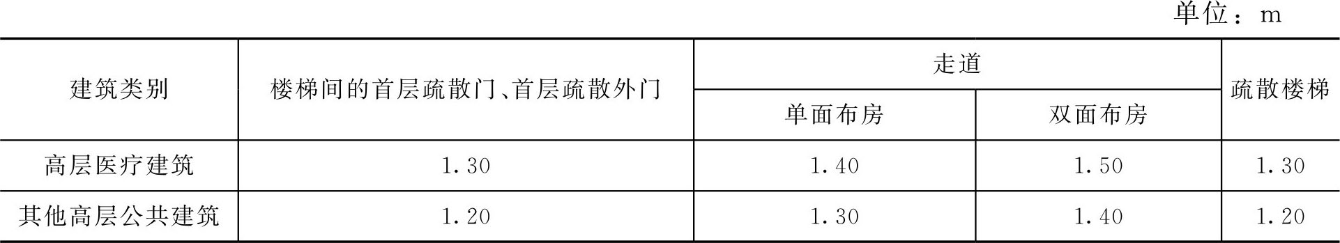 表1-8 高层公共建筑内楼梯间的首层疏散门、首层疏散外门、疏散走道和疏散楼梯的最小净宽度