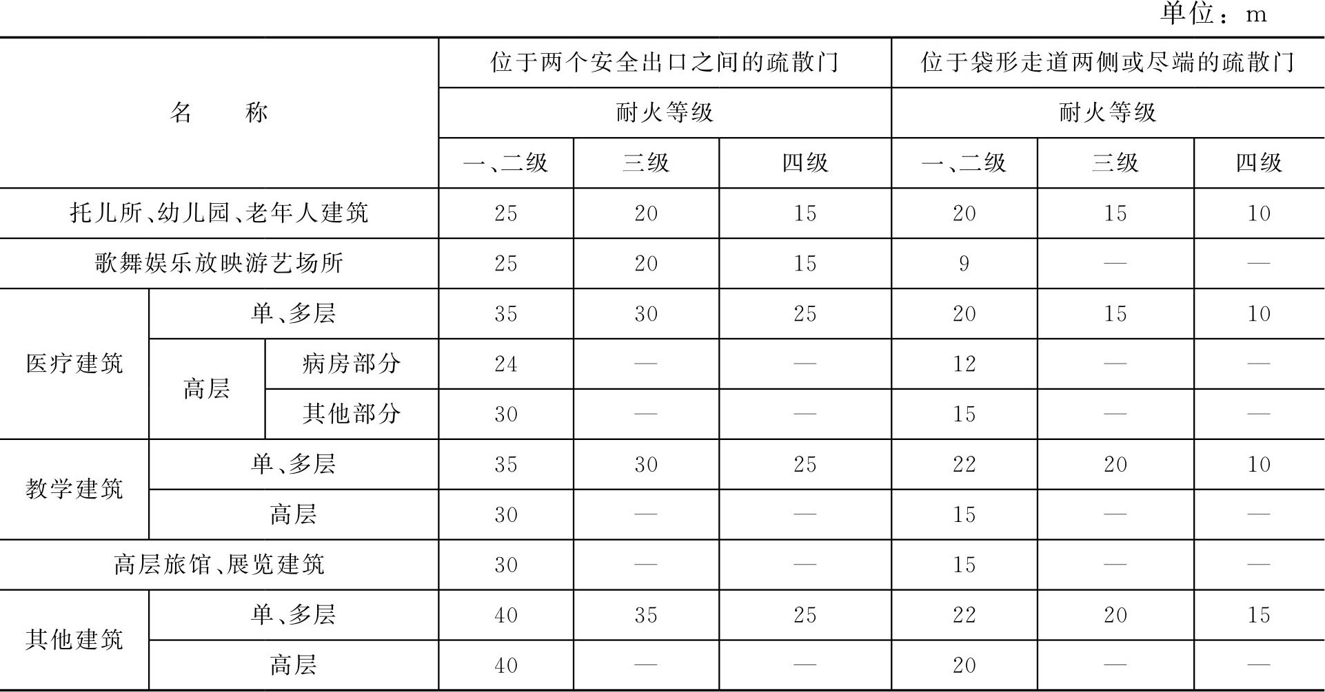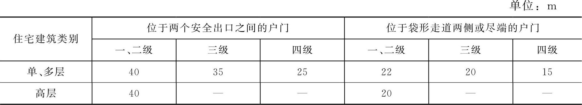 注:1.开向敞开式外廊的户门至最近安全出口的最大直线距离可按本表的规定增加5m。