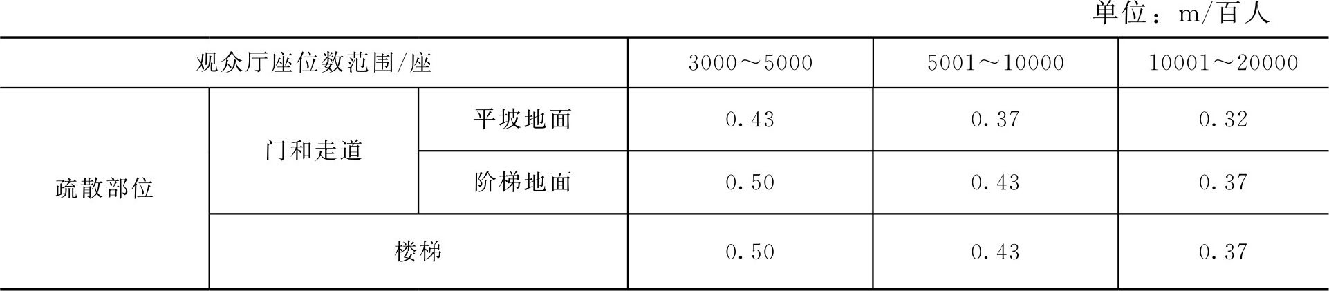 ③体育馆供观众疏散的所有内门、外门、楼梯和走道的各自总净宽度,应根据疏散人数按每100人的最小疏散净宽度不小于表1-10的规定计算确定。
