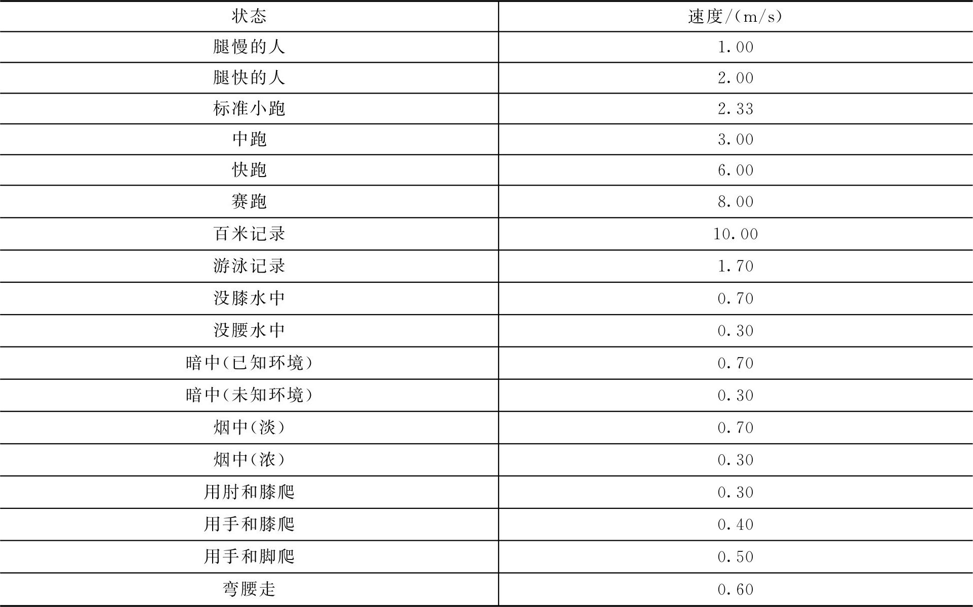 ①人员步行速度 一旦决定开始疏散行动之后,疏散人员将不断调整自己的行为决策,以受到的约束和障碍程度最小为原则,争取在最短的时间内到达当前的安全目标。建筑空间中人流密度是制约人员疏散行为心理和疏散流动能力的一个至关重要的因素。