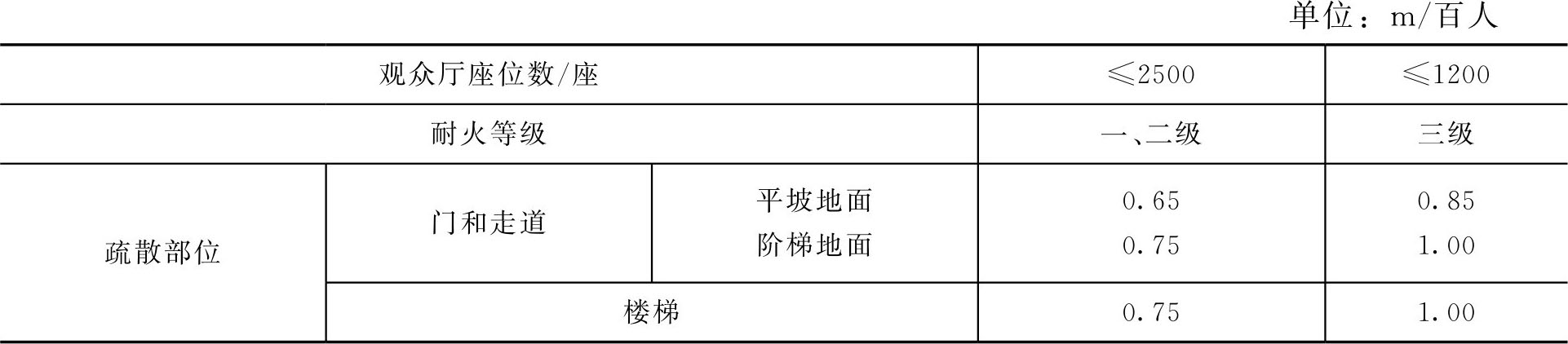 表1-9 剧场、电影院、礼堂等场所每100人所需最小疏散净宽度