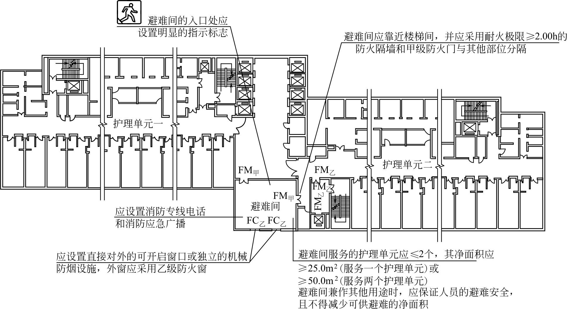 ①避难间服务的护理单元不应超过2个,其净面积应按每个护理单元不小于25.0m 2 确定。